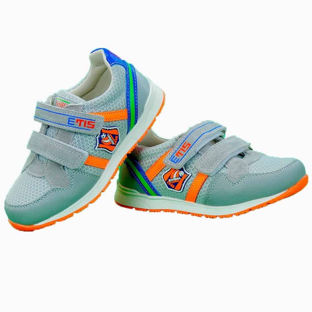 Adidasii pentru baieti sunt in ton de gri deschis si cu portocaliu.
