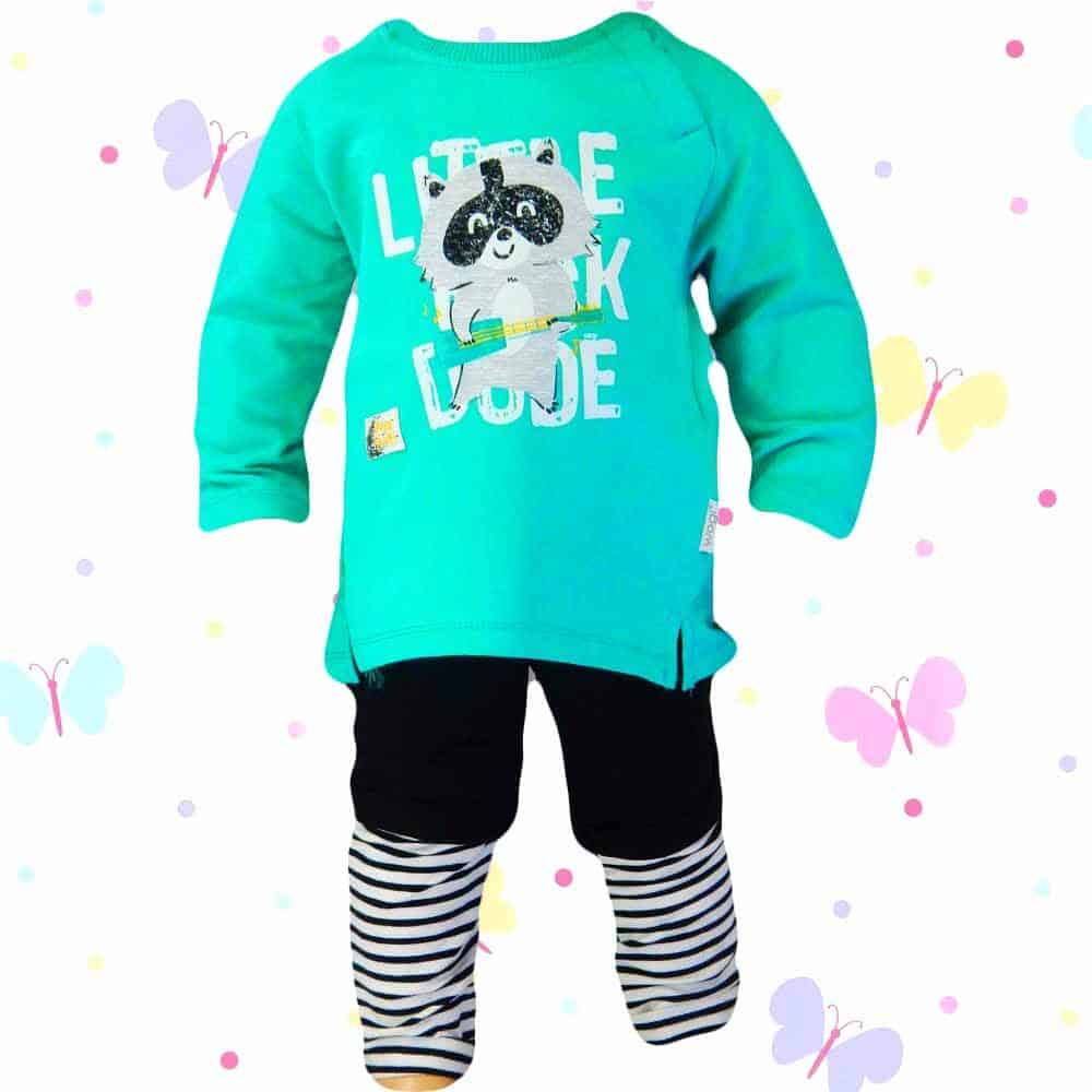 Setul pentru bebe are bluza turcoaz cu desene imprimate in partea din fata.