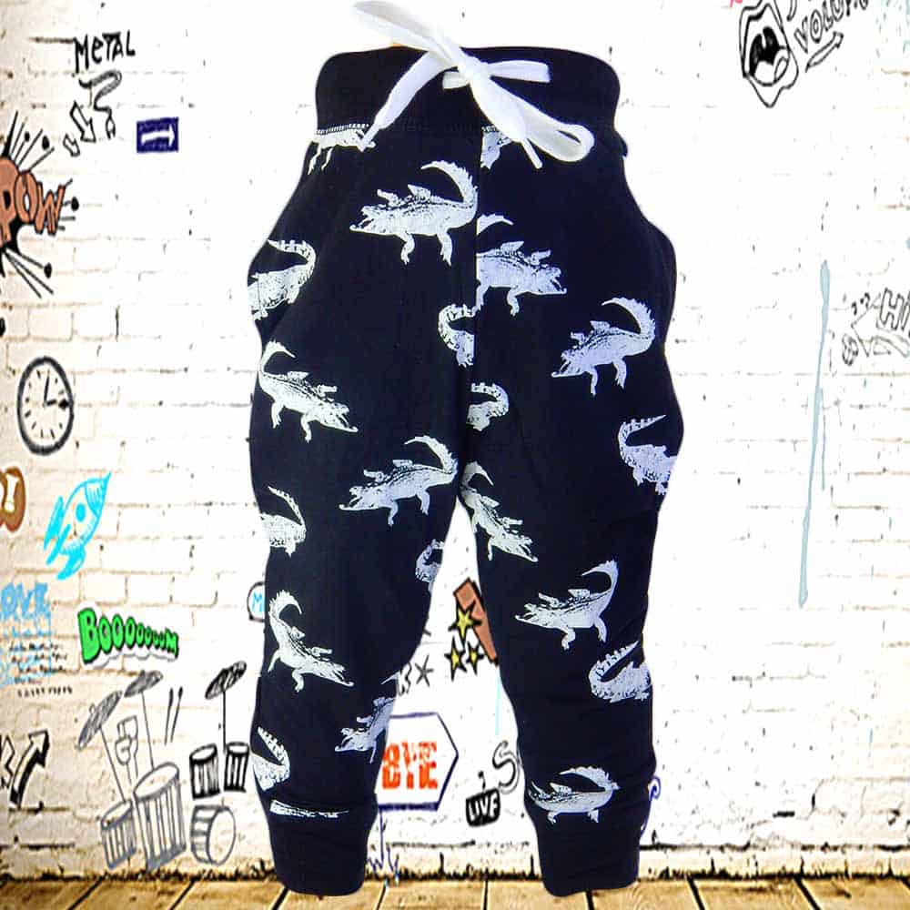 Pantalonii de trening sunt in ton de negru cu crocodili albi imprimati.