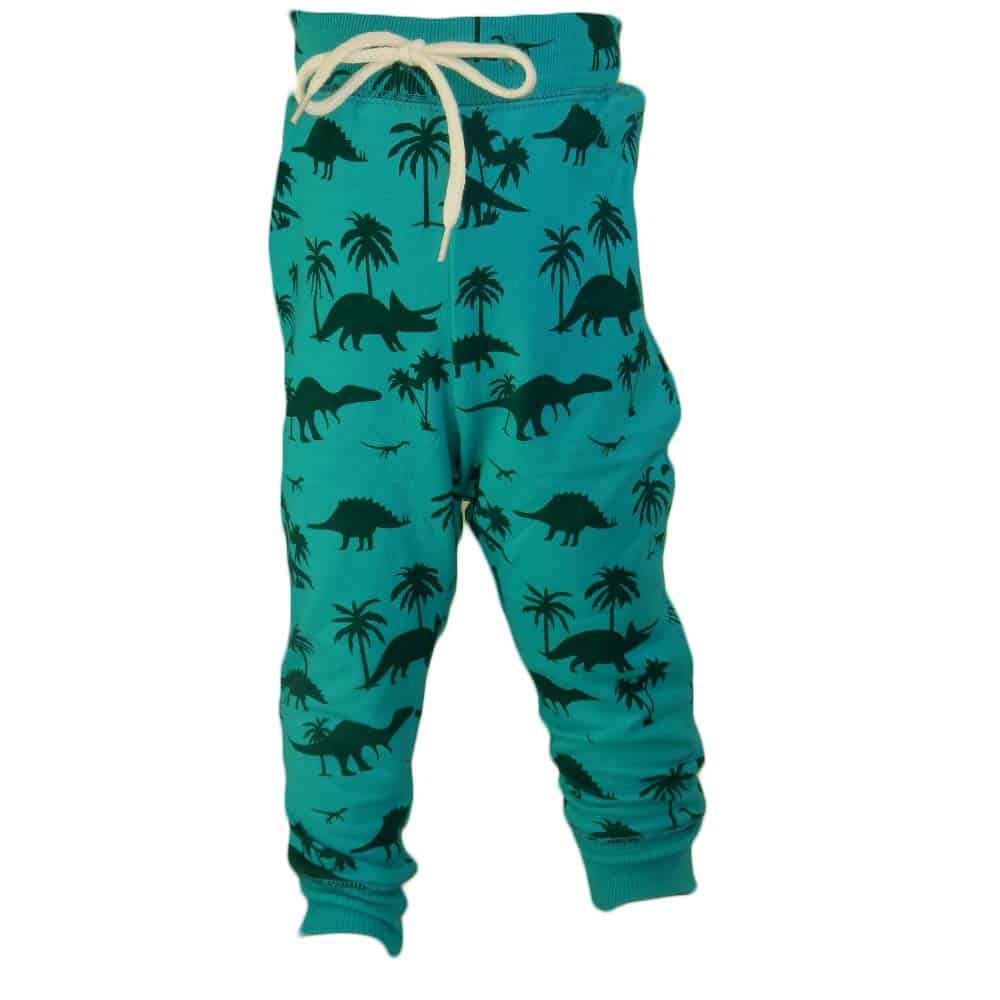 Pantalonii pentru baieti sunt in ton de albastru verzui cu dinozauri si palmieri.