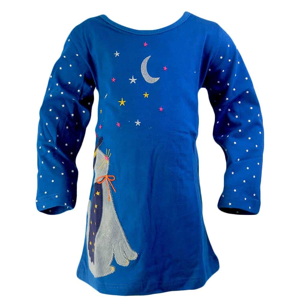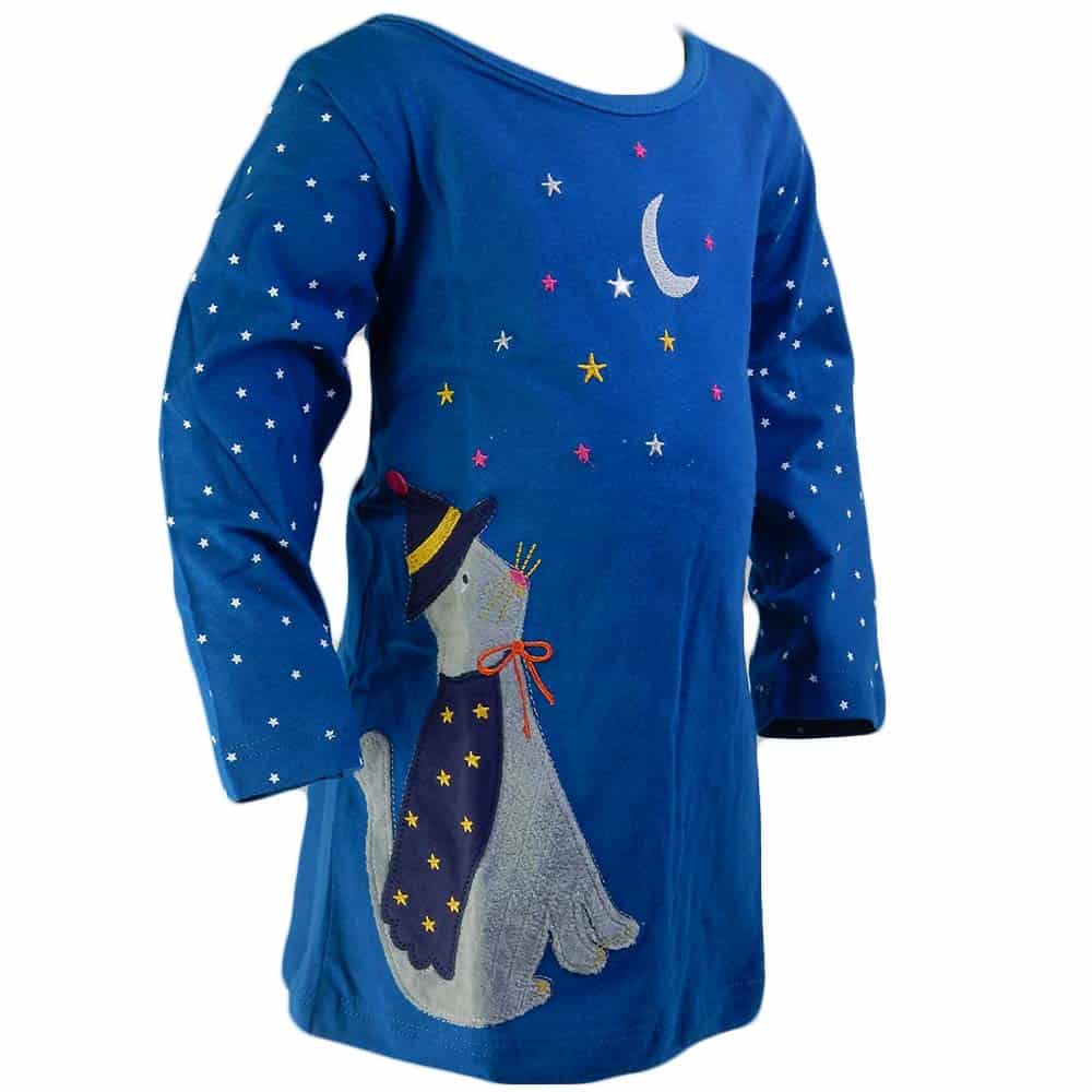 Rochia pentru fete este in ton de albastru, cu desene viu colorate un motan, stele si luna.