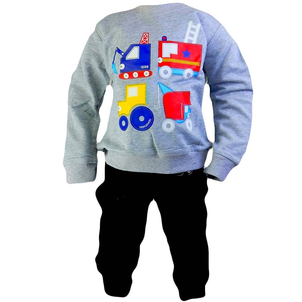 Bluze de trening pentru copii este in ton de gri cu masini si utilaje pe partea din fata.