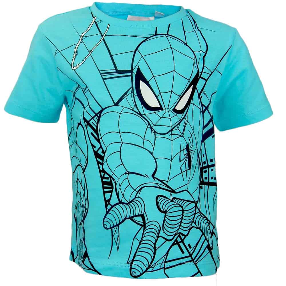 Tricoul pentru baieti este in ton de turcoaz cu Spiderman pe partea din fata.