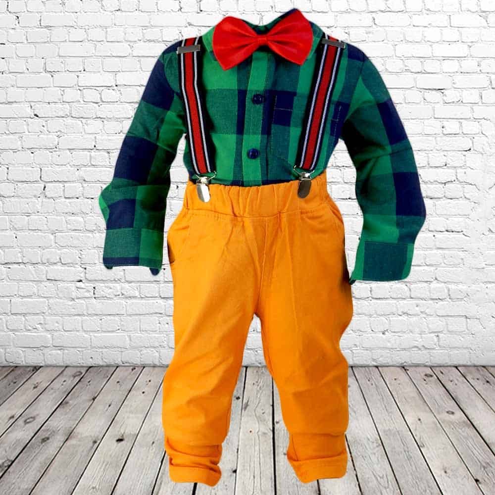 Compleul pentru copii este din 4 piese pantaloni, camasa, bretele si papion.