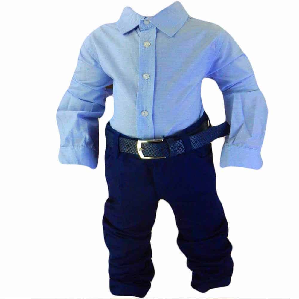 Compleul pentru bebelusi si copii are 4 piese, camasa, pantaloni, curea si pulover;