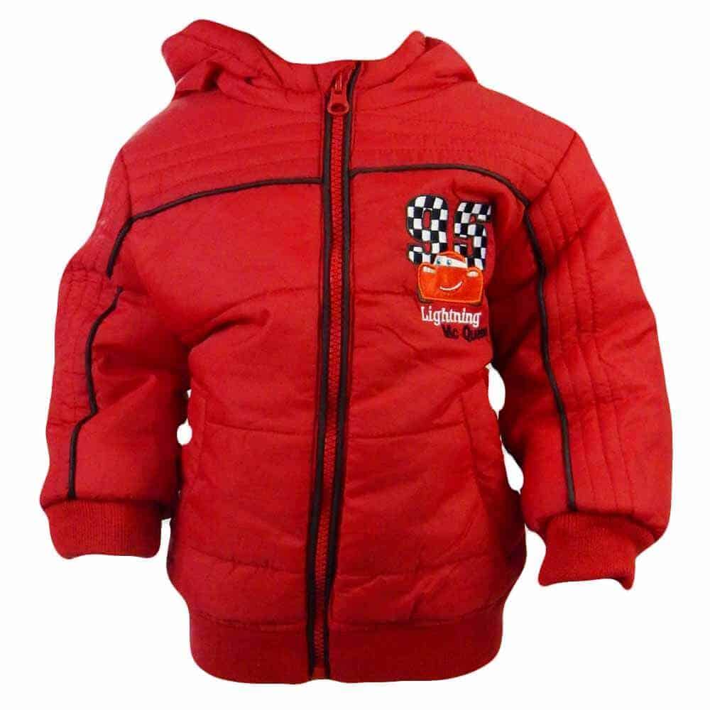 Geaca este groasa in ton de rosu inchis cu desenele disney Cars;