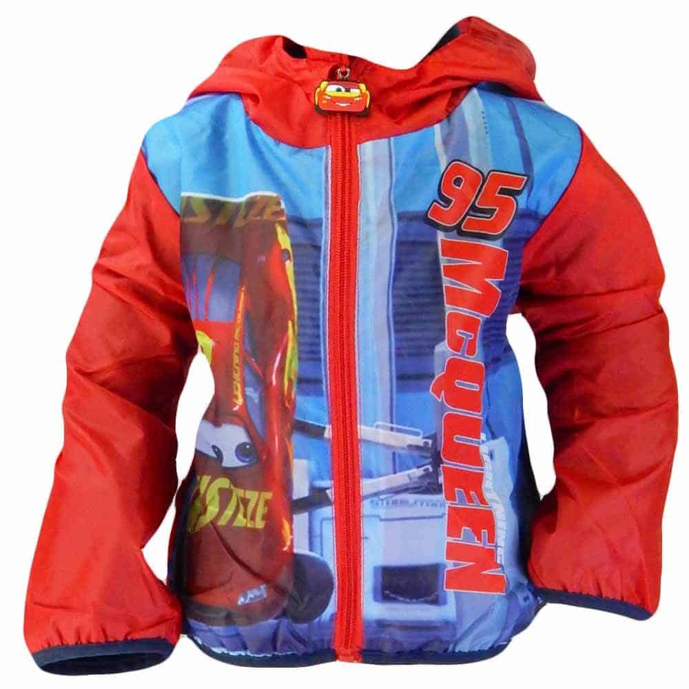 Geaca pentru copii este in ton de rosu cu desenele disney Cars, McQeen.