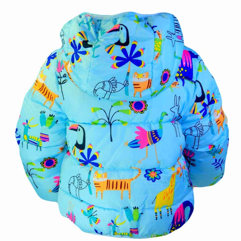 Geaca pentru fete este in ton de turcoaz cu desene colorate.