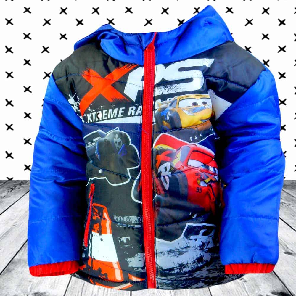 Geaca pentru baieti este in ton de albastru cu desenele disney Cars imprimate pe toata partea din fata.