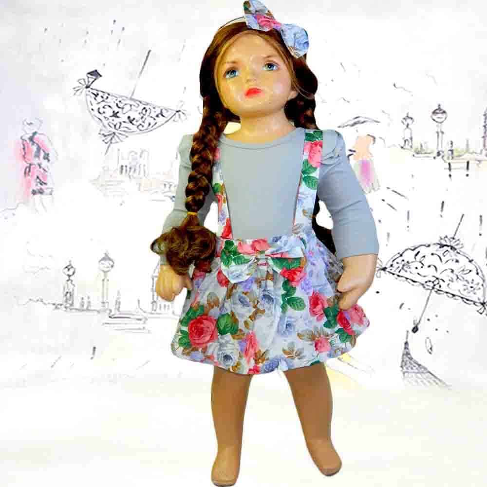 Setul pentru fetite este viu colorat, cu body uni, gri cu fustita cu bretele cu flori viu colorate;