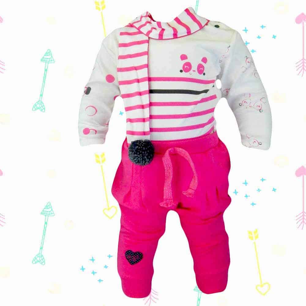 Setul pentru bebe are body, pantaloni si fular, ideal pentru sezonul primavara/toamna.