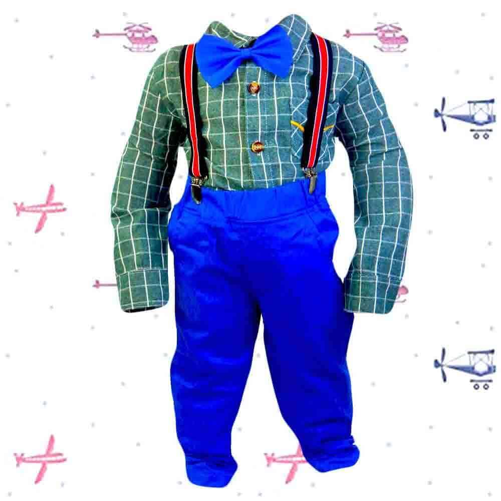 Compleul pentru copii este din 4 piese pantaloni, camasa, bretele si papion.