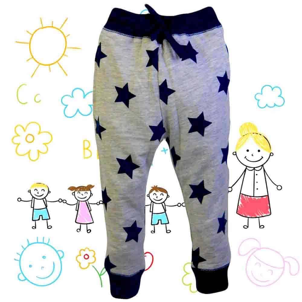 Pantalonii de trening pentru copii sunt in ton de gri cu stelute bleumarin;