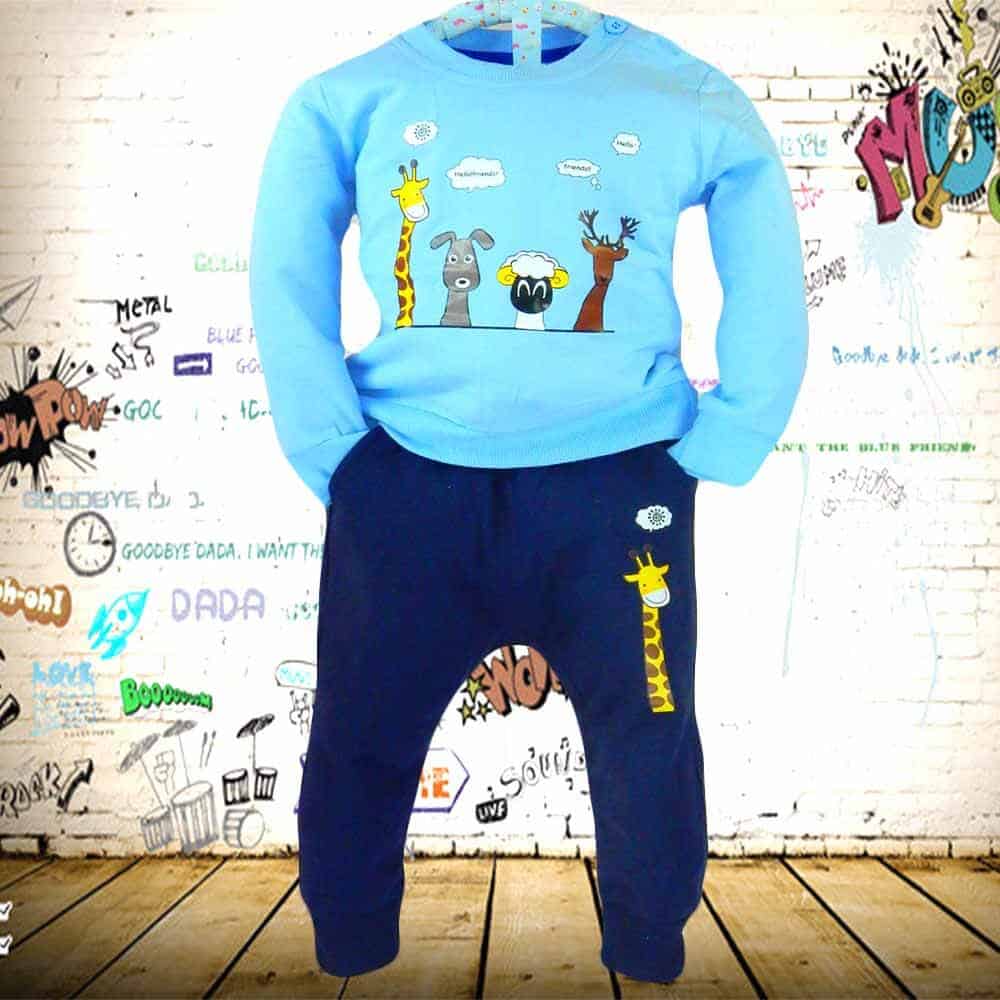 Pantalonii pentru baieti se potrivesc perfect cu bluza, sunt in ton de bleumarin si au o girafa pe piciorul stang.