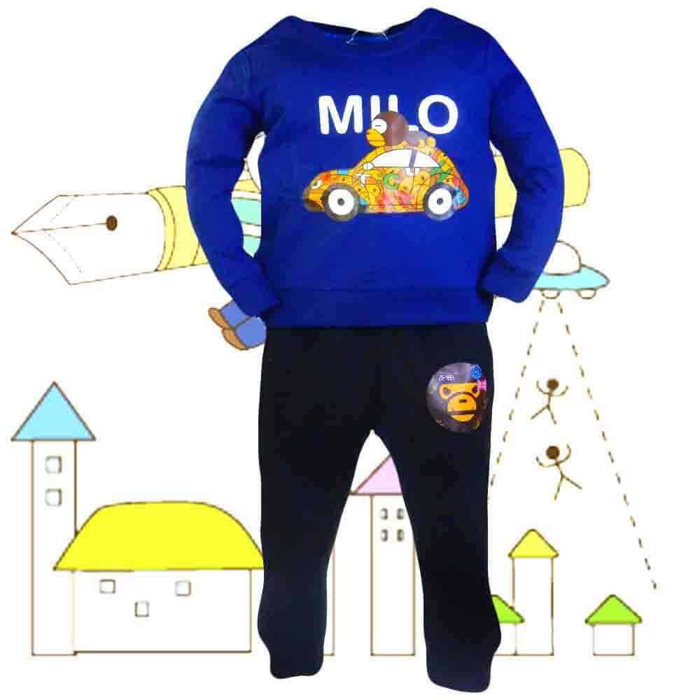 Treningul pentru copii are bluza albastra cu desene viu colorate, maimutica Milo.