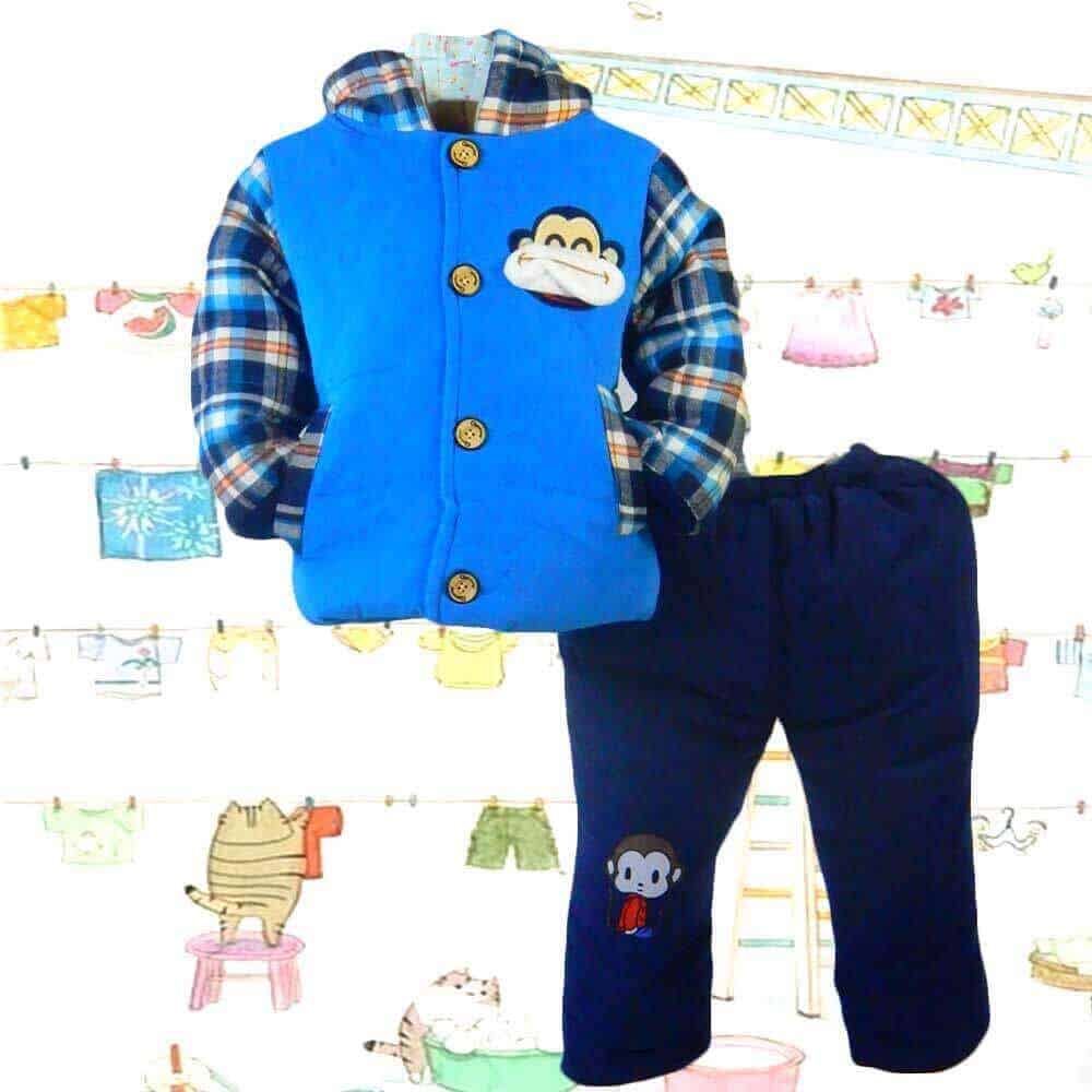 Geaca este in ton de albastru cu nasturi, cu desene vesele Maimutica;
