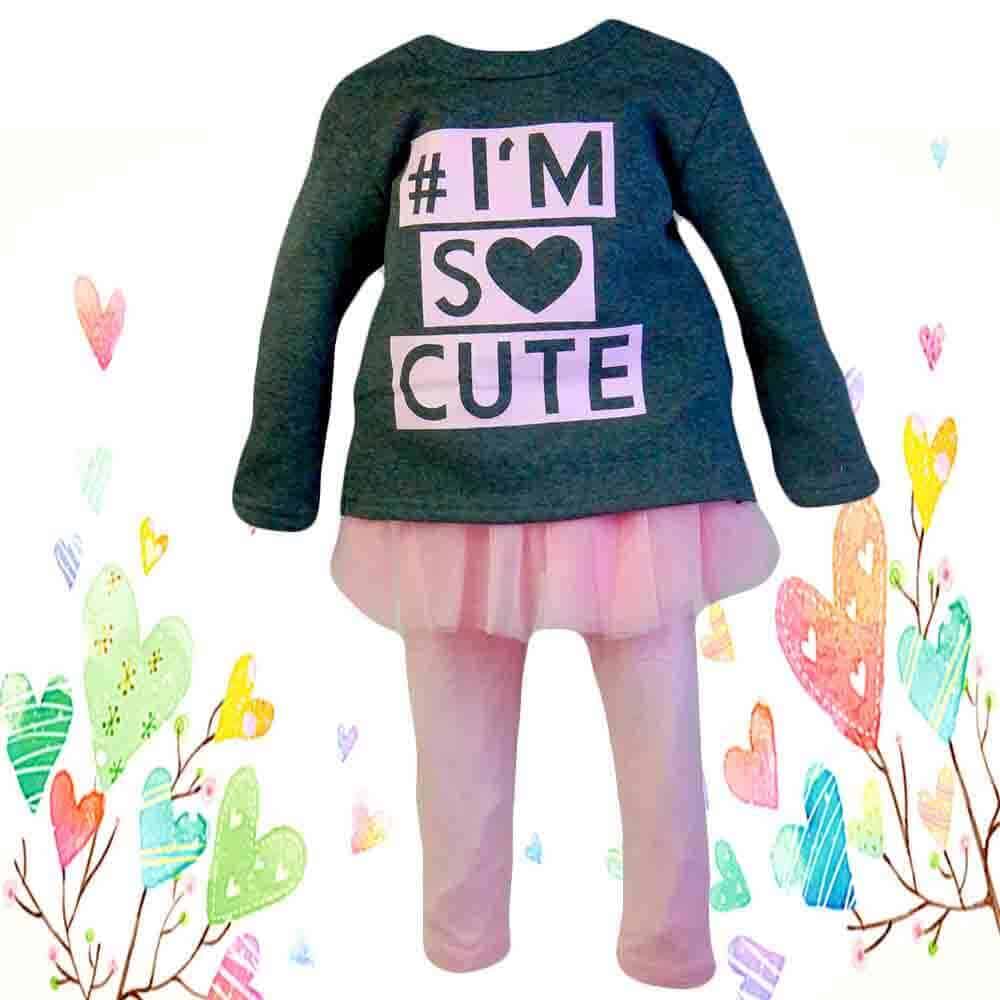 Compleul de fete are bluza in ton de gri cu un mesaj inscriptionat.