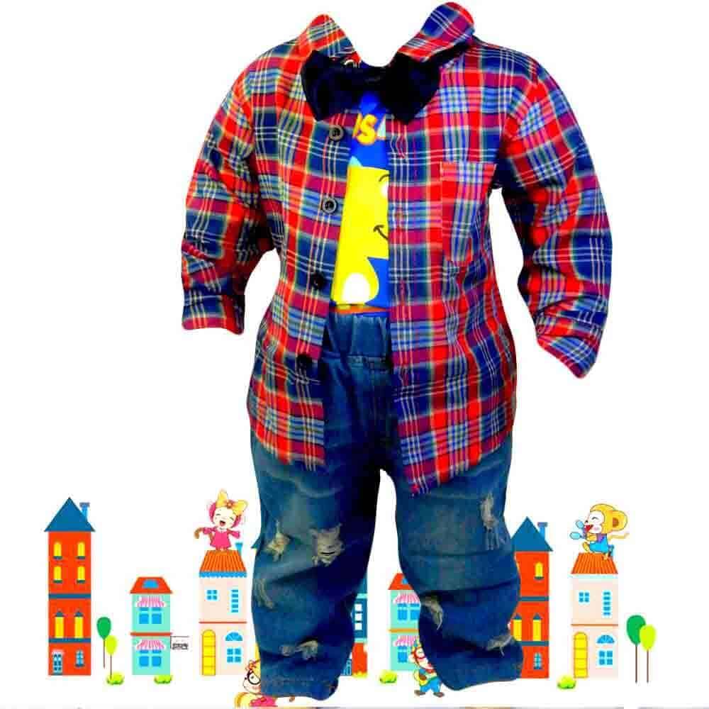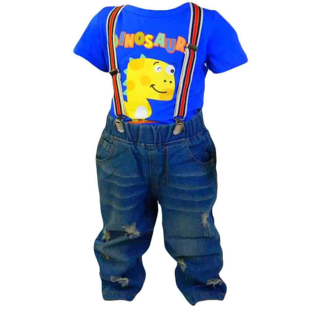 Compleul de copii este din 5 piese, blugi, camasa, papion detasabil, bretele si tricou Dino;