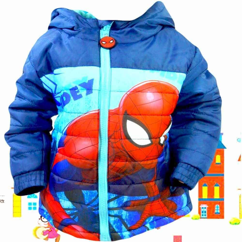 Geaca de iarna este in ton de albastru cu personajul disney Spiderman;
