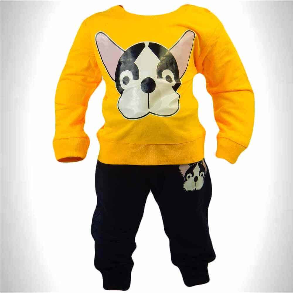 Treningul pentru copii este asortat, bluza in ton de galben si pantalonii in ton de negru;