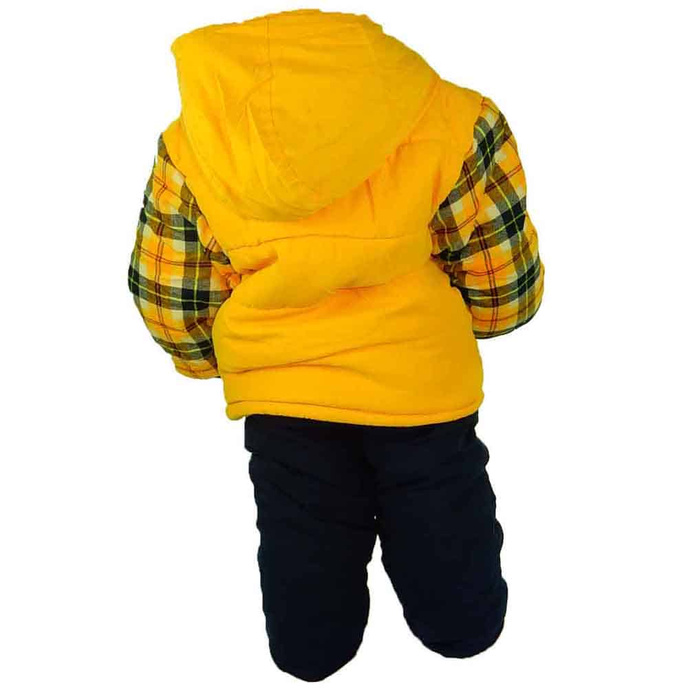 Geaca este groasa, imblanita pe interior, in ton de galben cu manecile in carouri;