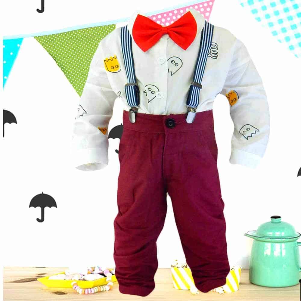 Camasa pentru baieti este in ton de alb cu desene amuzante, papionul este rosu.