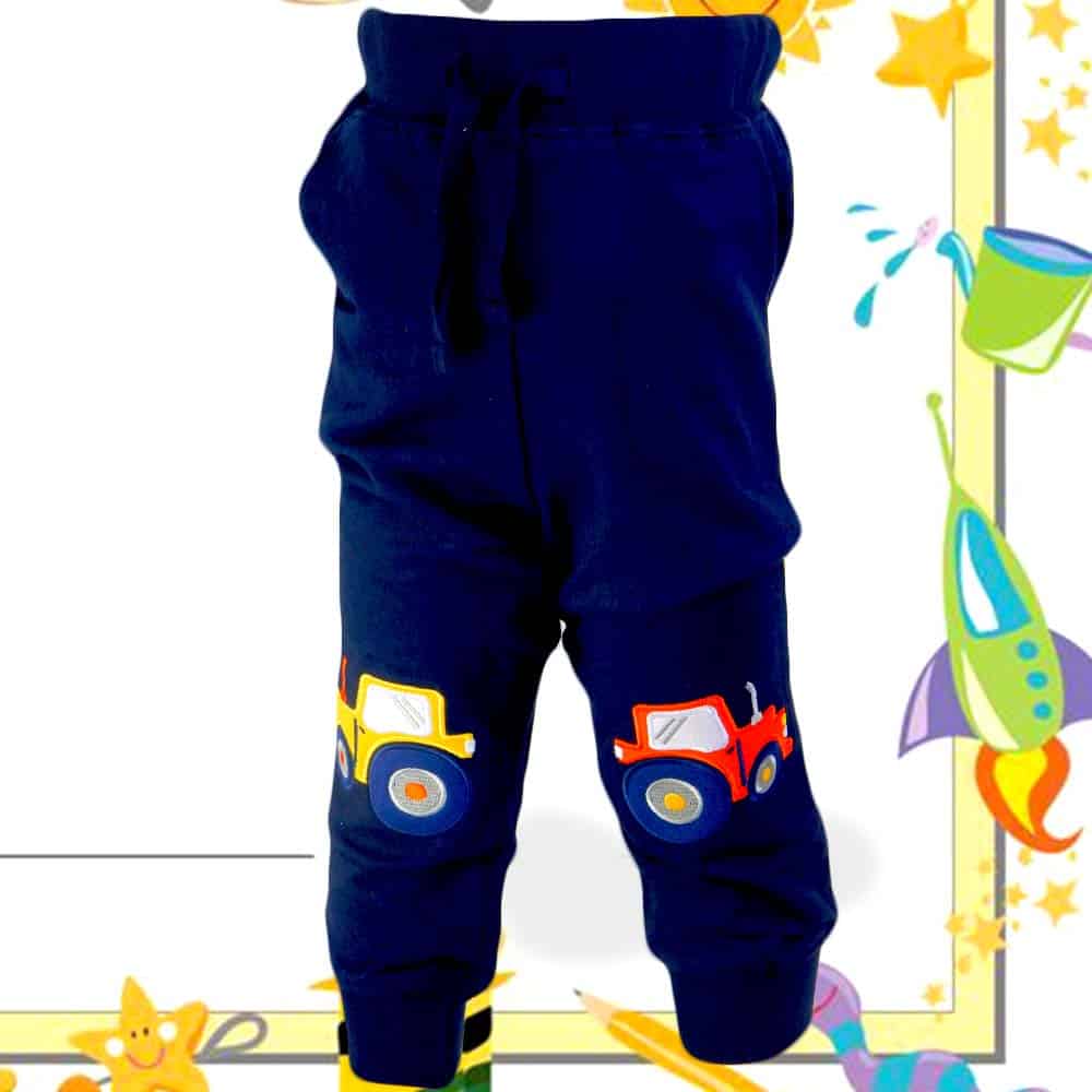 Pantalonii de trening pentru copii sunt in ton de bleumarin cu tractoare colorate.