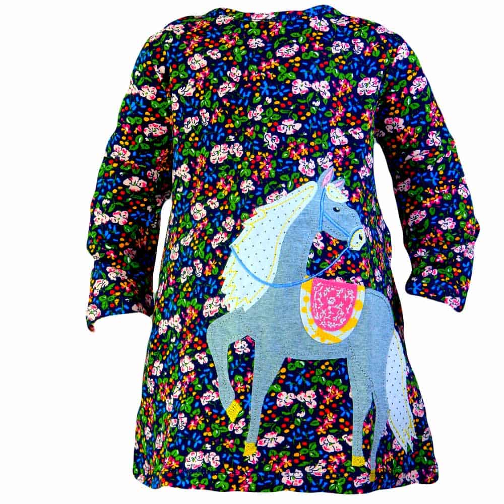 Rochita pentru fete este in ton de bleumarin cu flori colorate si cu un calut in partea din fata.