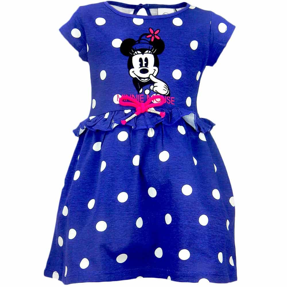 Rochia pentru fete este in ton de bleumarin cu buline albe si cu personajul disney Minnie Mouse.