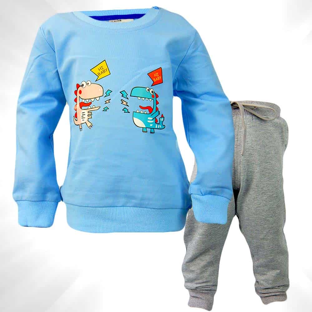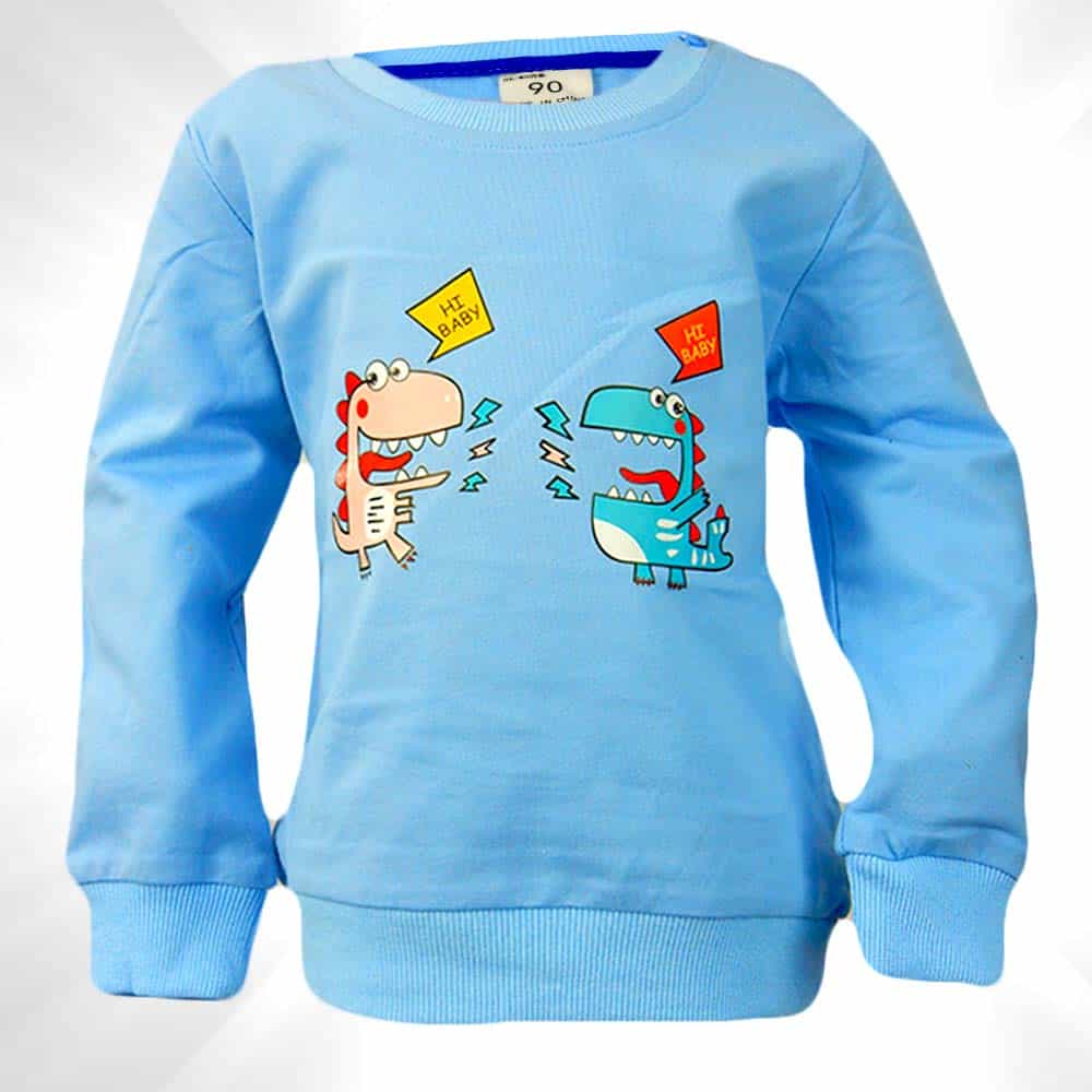 Bluza este in ton de albastru cu dinozauri;