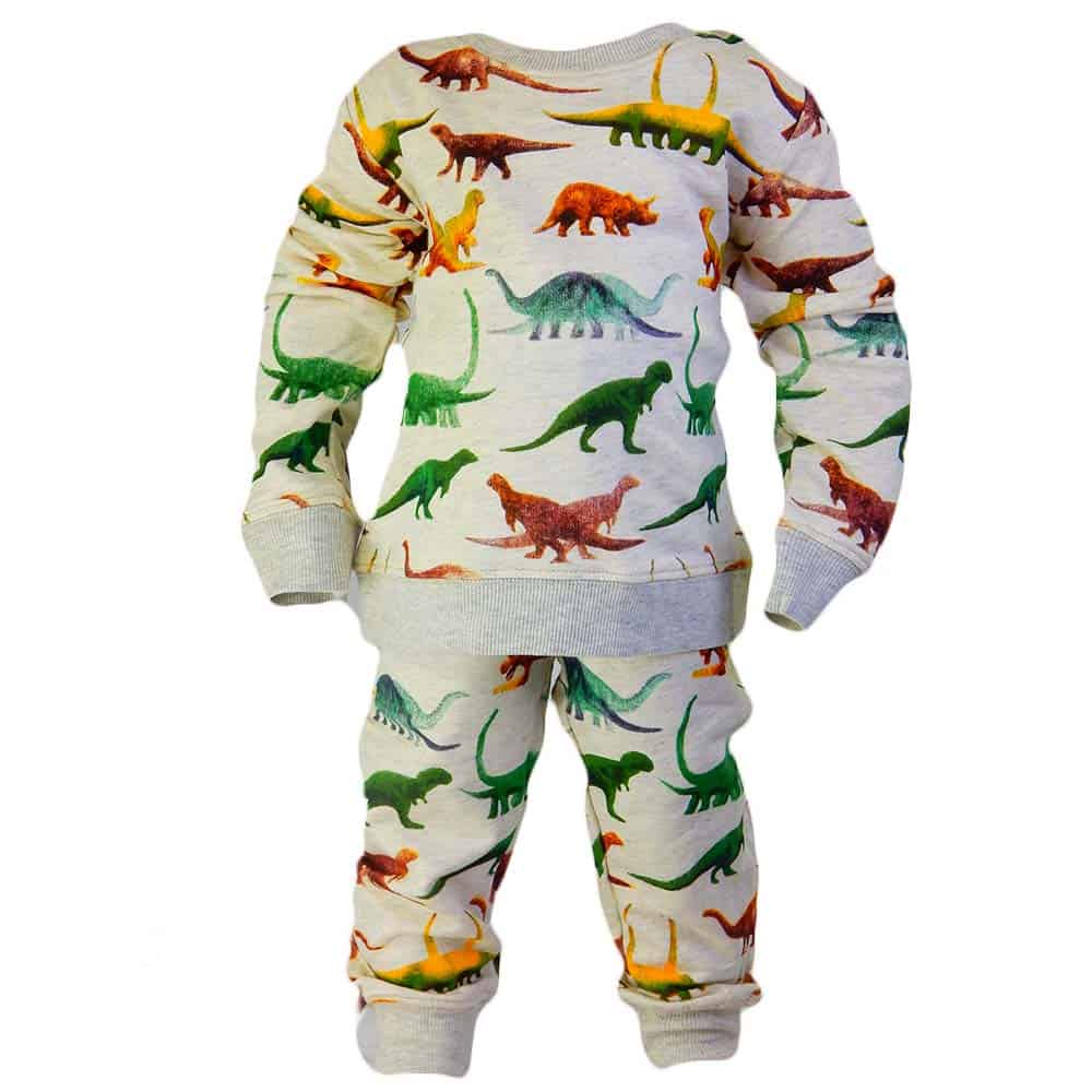 Treningul pentru baieti este in ton de gri cu dinozauri colorati.