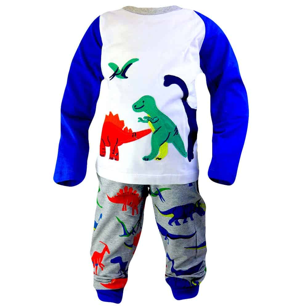 Bluza pentru baieti este in ton de alb cu manecile albastre, are dinozauri colorati pe partea din fata.