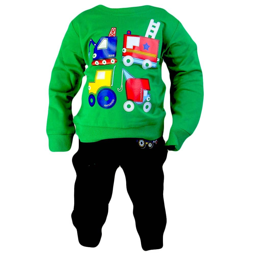 Bluza de trening pentru copii este in ton de verde cu masini si utilaje pe partea din fata.
